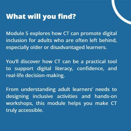 In our COMPutational Seniors module 5 we will explore how Computational Thinking can serve as a powerful tool for fostering digital inclusion among disadvantaged adults.