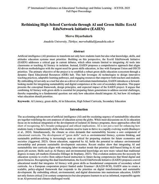 Our EAIEN Project paper “Rethinking High School Curricula through AI and Green Skills: EcoAI EduNetwork Initiative (EAIEN)” has been officially published in the Full Paper Proceedings of the 5th International Conference on Educational Technology and Online Learning (ICETOL 2025).