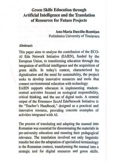 We’re proud to share that our EAIEN Project partner Ana-Maria Dascalu-Romitan from Politehnica University of Timișoara presented this insightful paper as part of the ECO-AI EduNetwork Initiative (EAIEN).